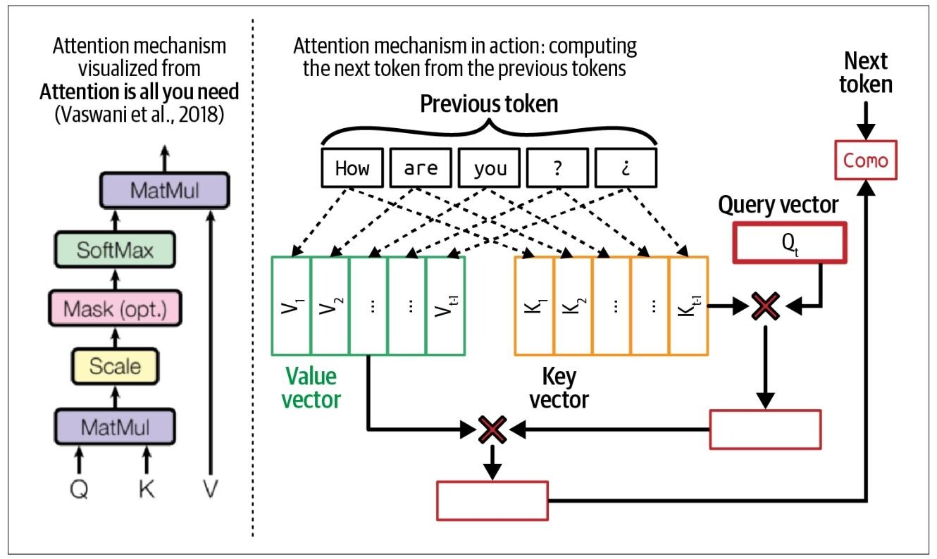 “The attention mechanism computes how much attention to give an input token by performing a dot product between the query vector and its key vector. A high score means that the model will use more of that page’s content (its value vector) when generating the book’s summary. A visualization of the attention mechanism with the key, value, and query vectors is shown in Figure 2-5. In this visualization, the query vector is seeking information from the previous tokens How, are, you, ?, ¿ (\dot{c}) to gen‐ erate the next token.”(摘录原文)